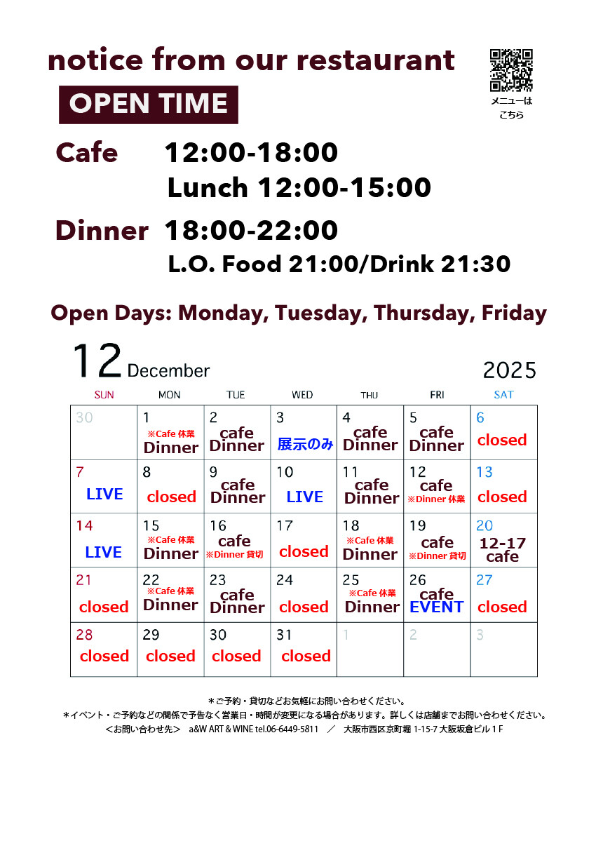 【レストランからのお知らせ】12月の営業スケジュール 2025.12.04 レストラン営業は、基本は月・火・木・金曜の12~22時(カフェ&ディナー)です。展覧会やイベント開催時、祝日などで営業形態が変わる場合がありますので、営業時間は下記カレンダーにてご確認ください。ご不便をおかけしますが、どうぞよろしくお願いいたします。