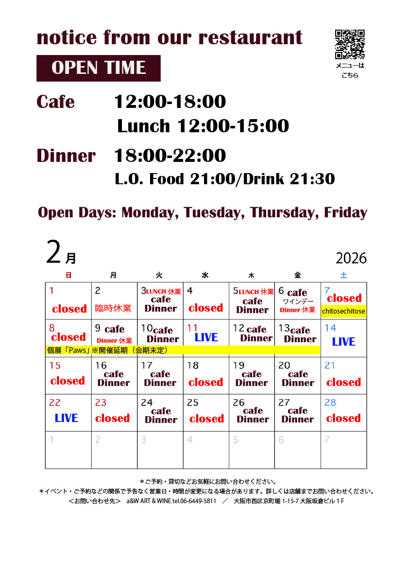 【レストランからのお知らせ】2月の営業スケジュール 2026.02.06 レストラン営業は、基本は月・火・木・金曜の12~22時(カフェ&ディナー)です。展覧会やイベント開催時、祝日などで営業形態が変わる場合がありますので、営業時間は下記カレンダーにてご確認ください。ご不便をおかけしますが、どうぞよろしくお願いいたします。